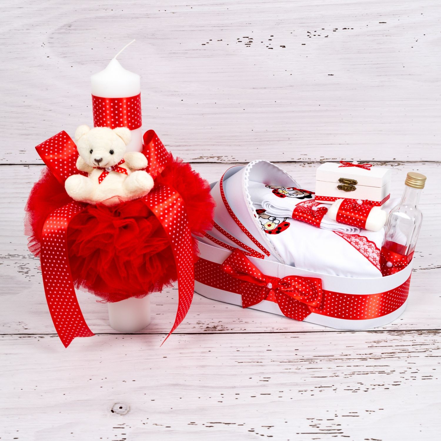 Pentru o fetita dragalasa care urmeaza sa primeasca taina botezului, nasii impreuna cu parintii pot hotari de comun acord sa cumpere un set botez format din lumanare biserica si trusou botez cu decor rosu cu buline, ursulet plus si gargarita.