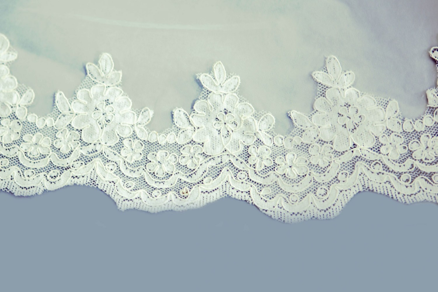 Voalul este realizat din tulle ivory foarte fin si este accesorizat cu dantela pe margine.